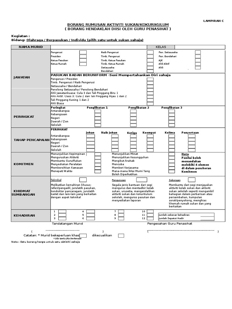 Aspek yang perlu diisi 1. BORANG REKOD KEHADIRAN PENYERTAAN UNTUK SUKAN KOKURIKULUM EKSTRA KURIKULUM 2012 Nama Sekolah. Free access to premium services like.